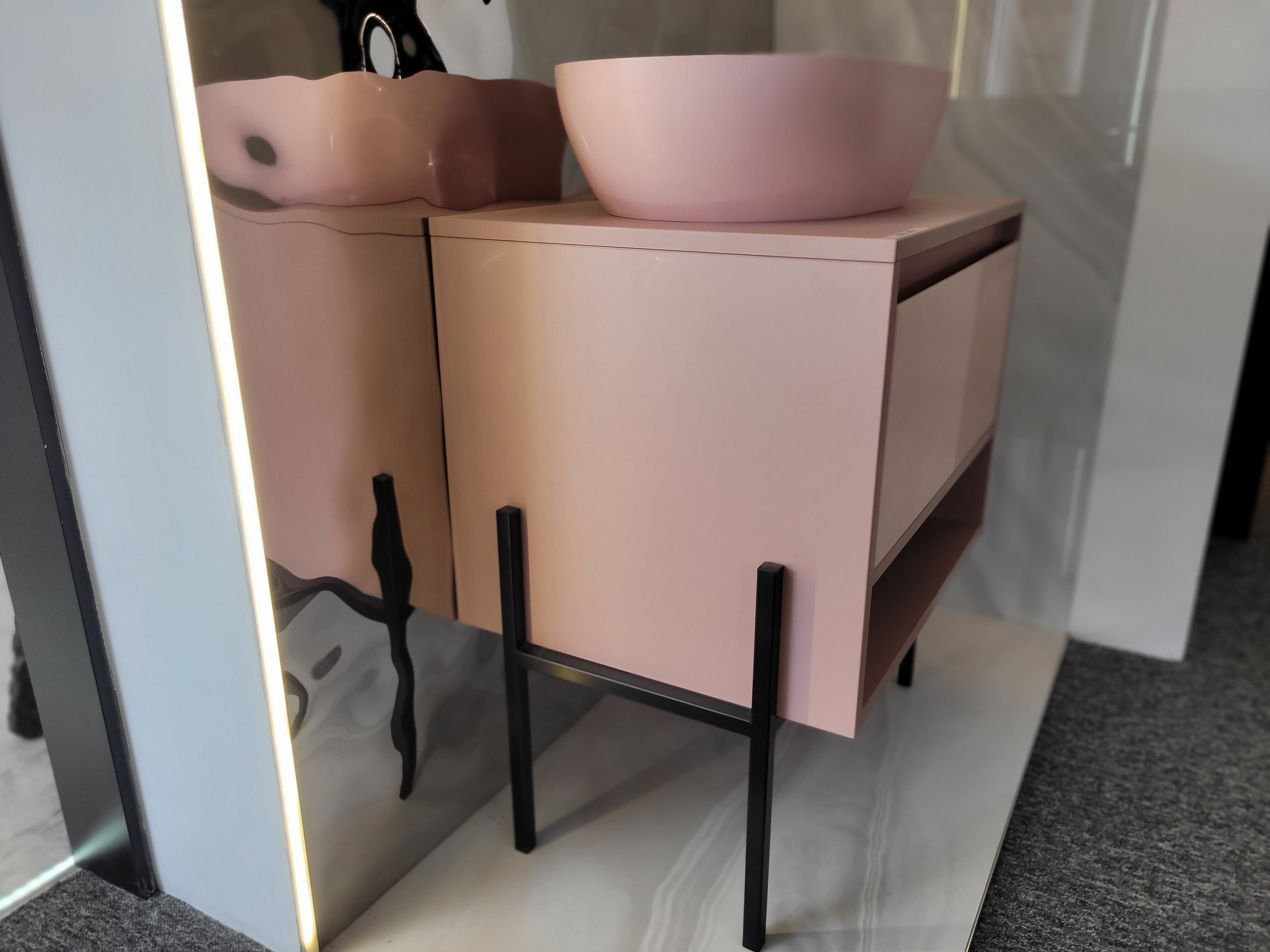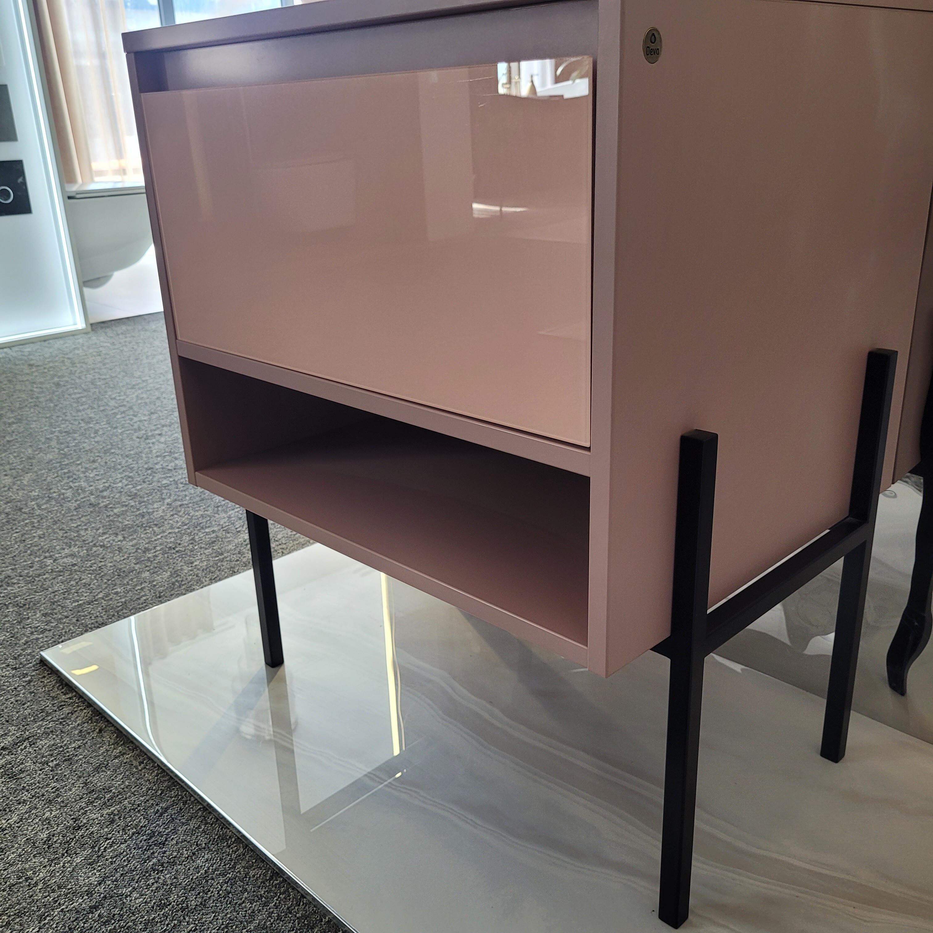 Nowoczesna szafka pod umywalkę o szerokości 60 cm z blatem. Produkt w kolorze pudrowy róż, idealnie pasujący do łazienki w stylu minimalistycznym lub loftowym. Solidna konstrukcja, płyta MDF i praktyczne rozwiązania zapewniają wygodne przechowywanie.