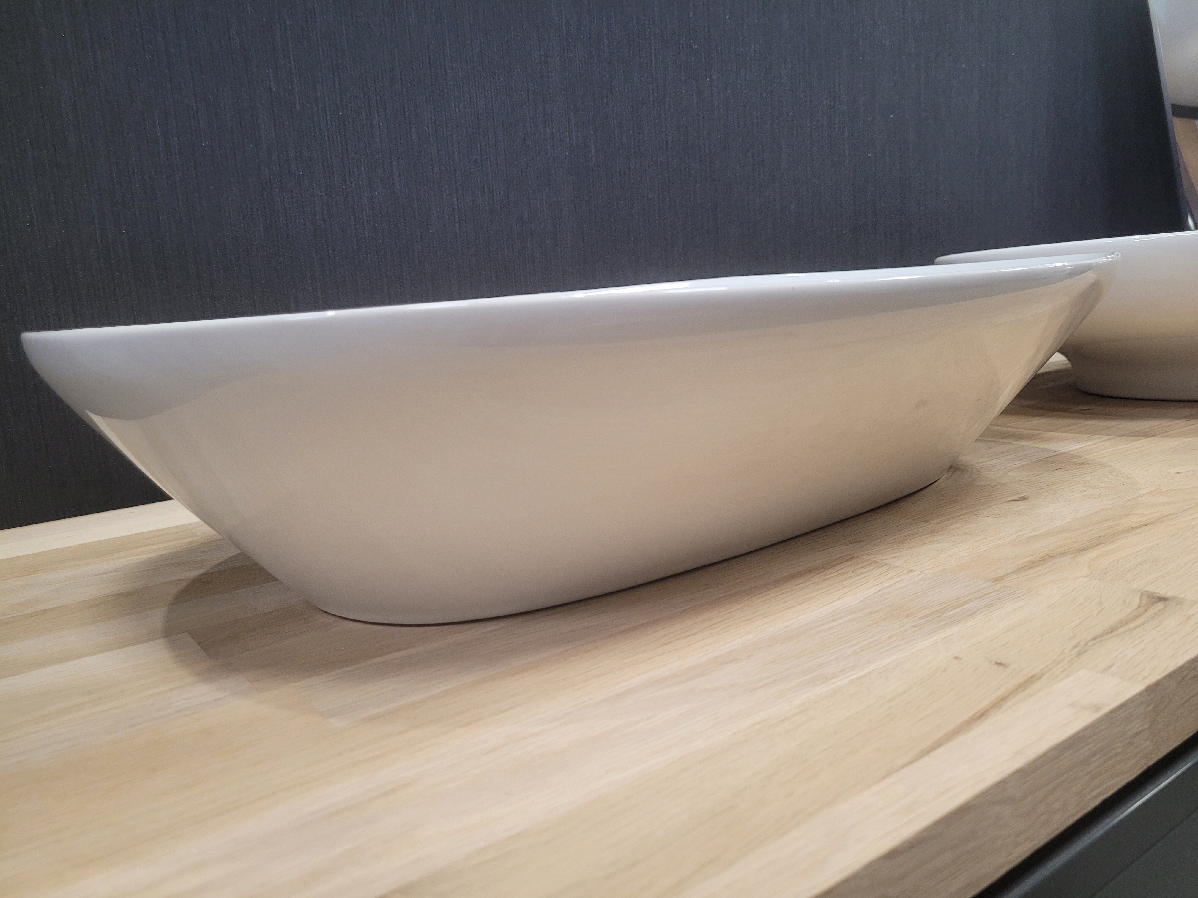 Stylowy umywalka nablatowa o owalnym kształcie i białym, błyszczącym wykończeniu.