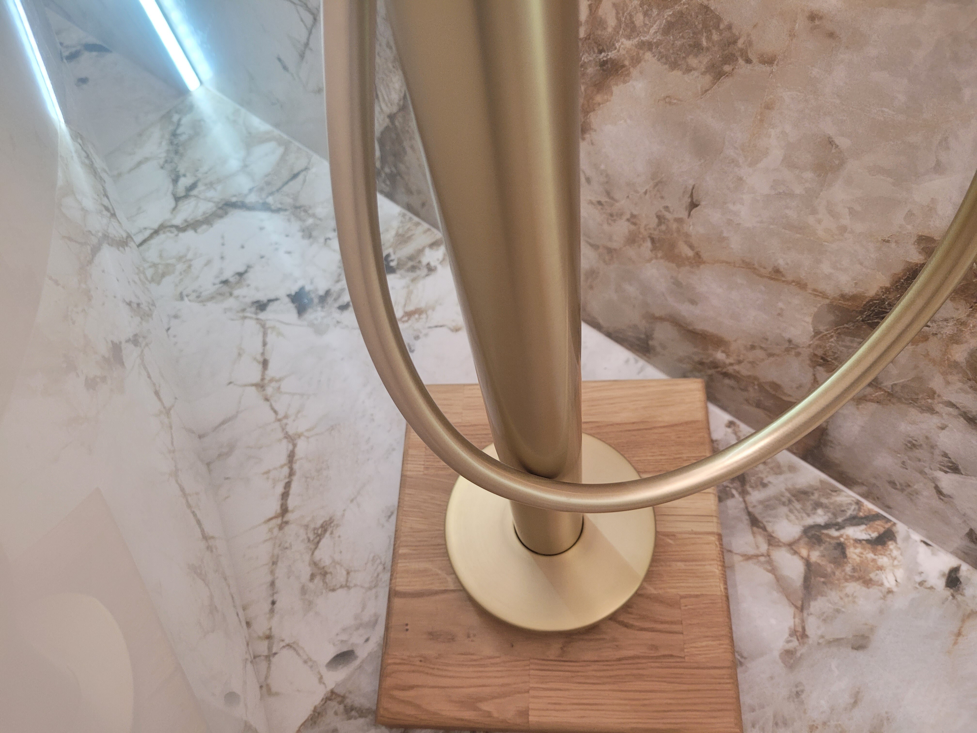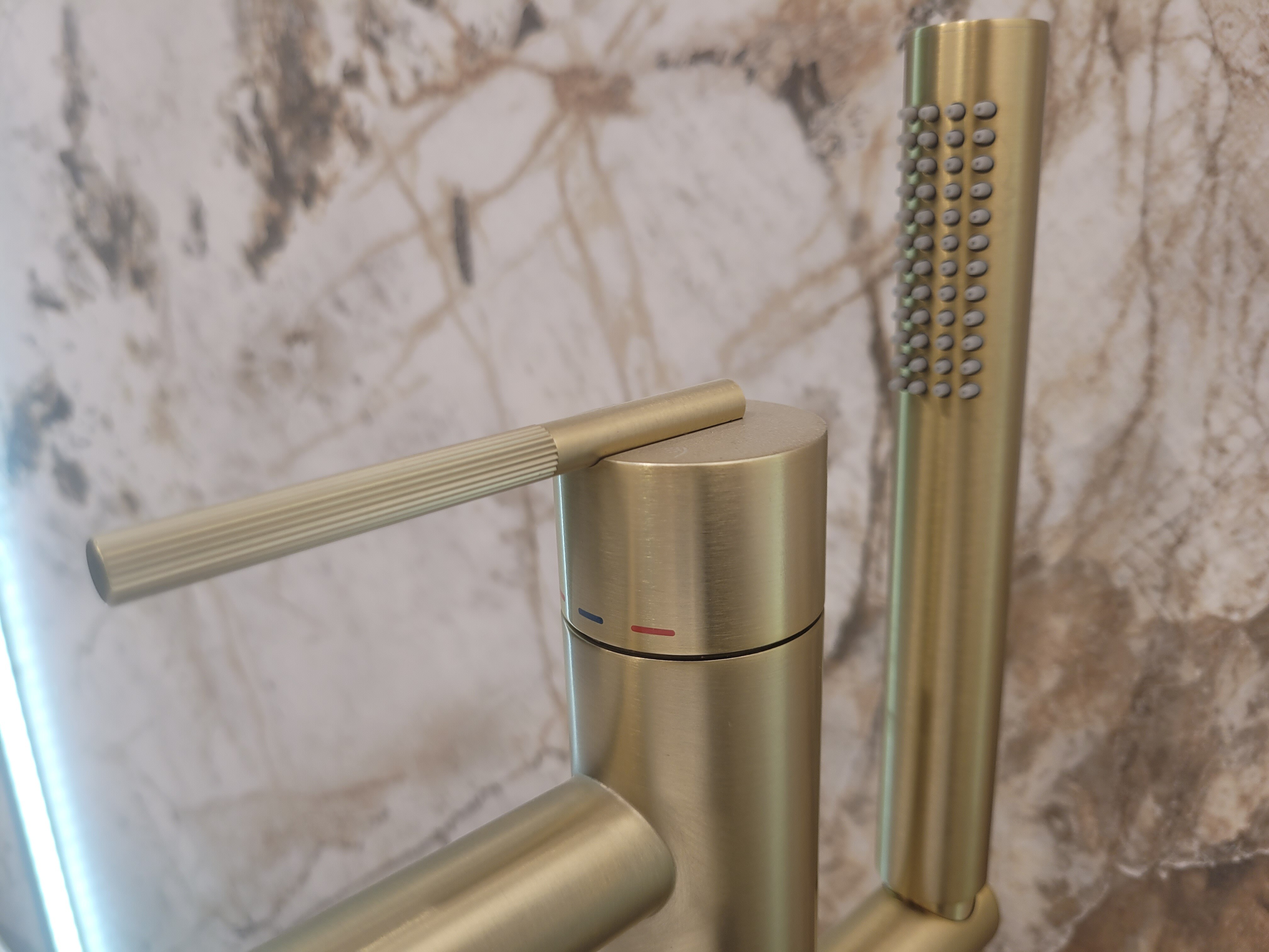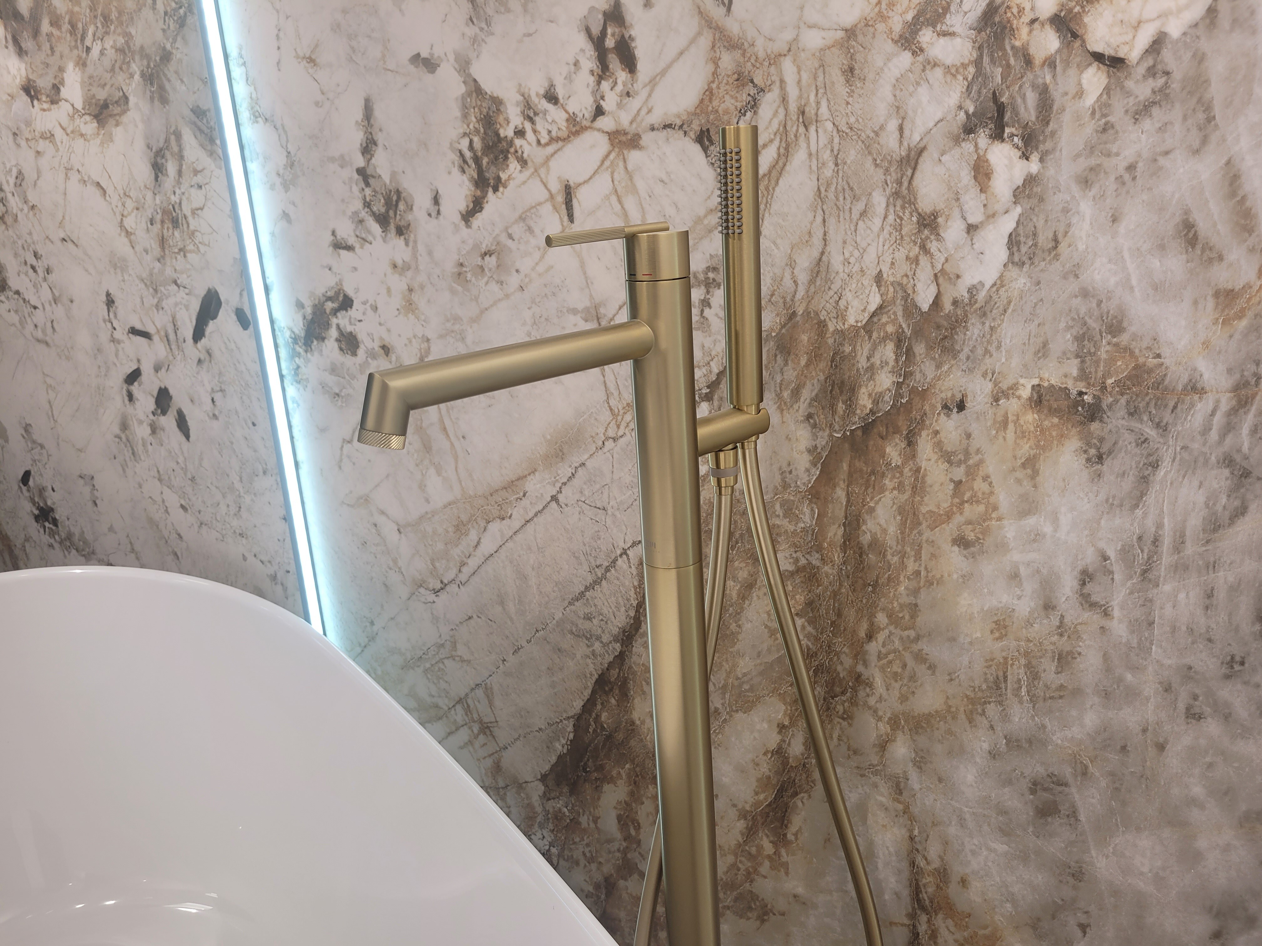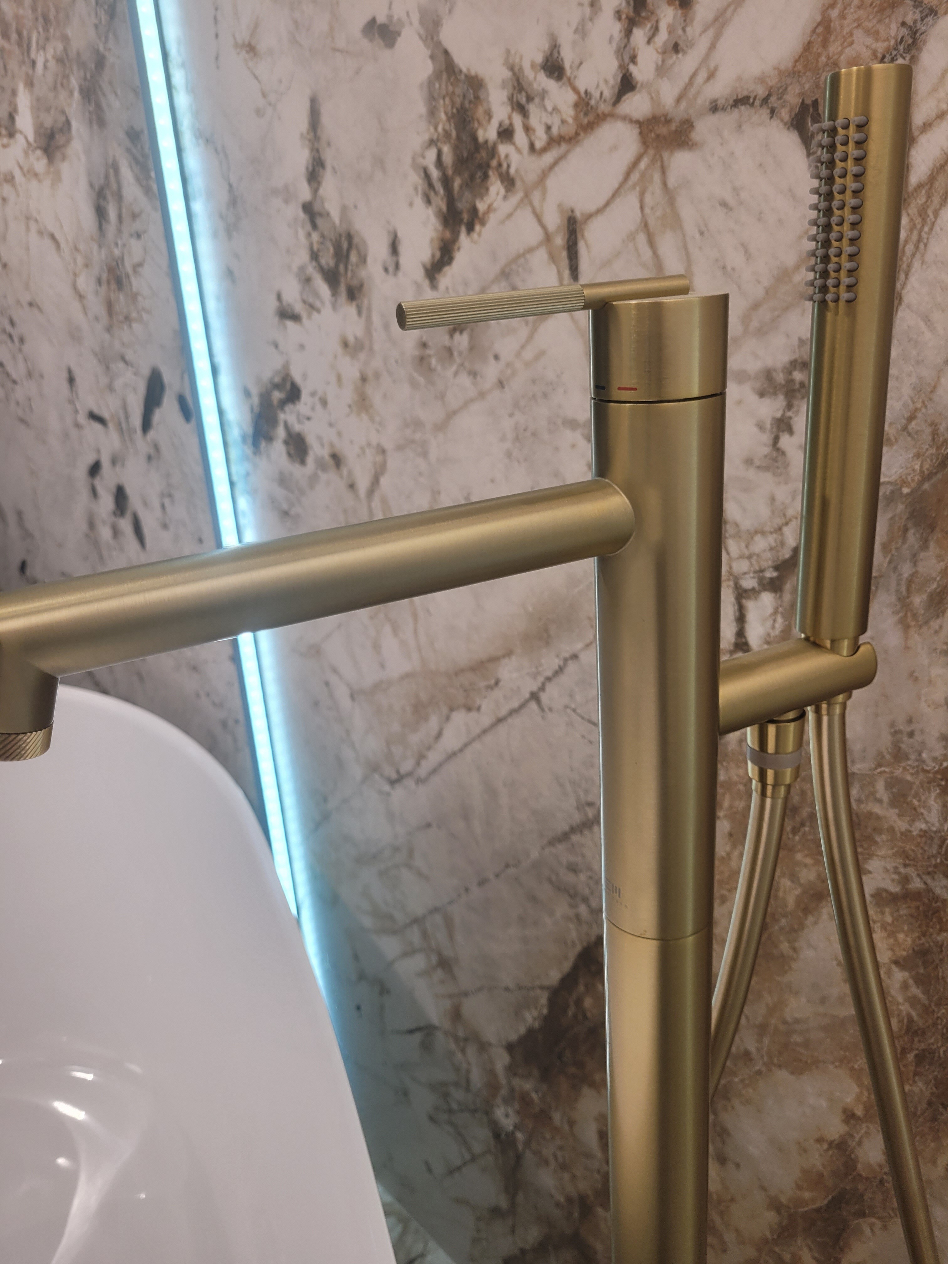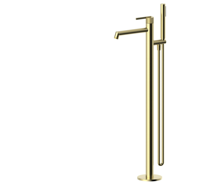 Bateria wannowa stojąca Emporia Rio w kolorze złotym szczotkowanym. Wyposażona w zestaw prysznicowy oraz element podłogowy. Nowoczesny i progresywny design idealnie dopasuje się do każdej łazienki. Kolor: złoty szczotkowany.