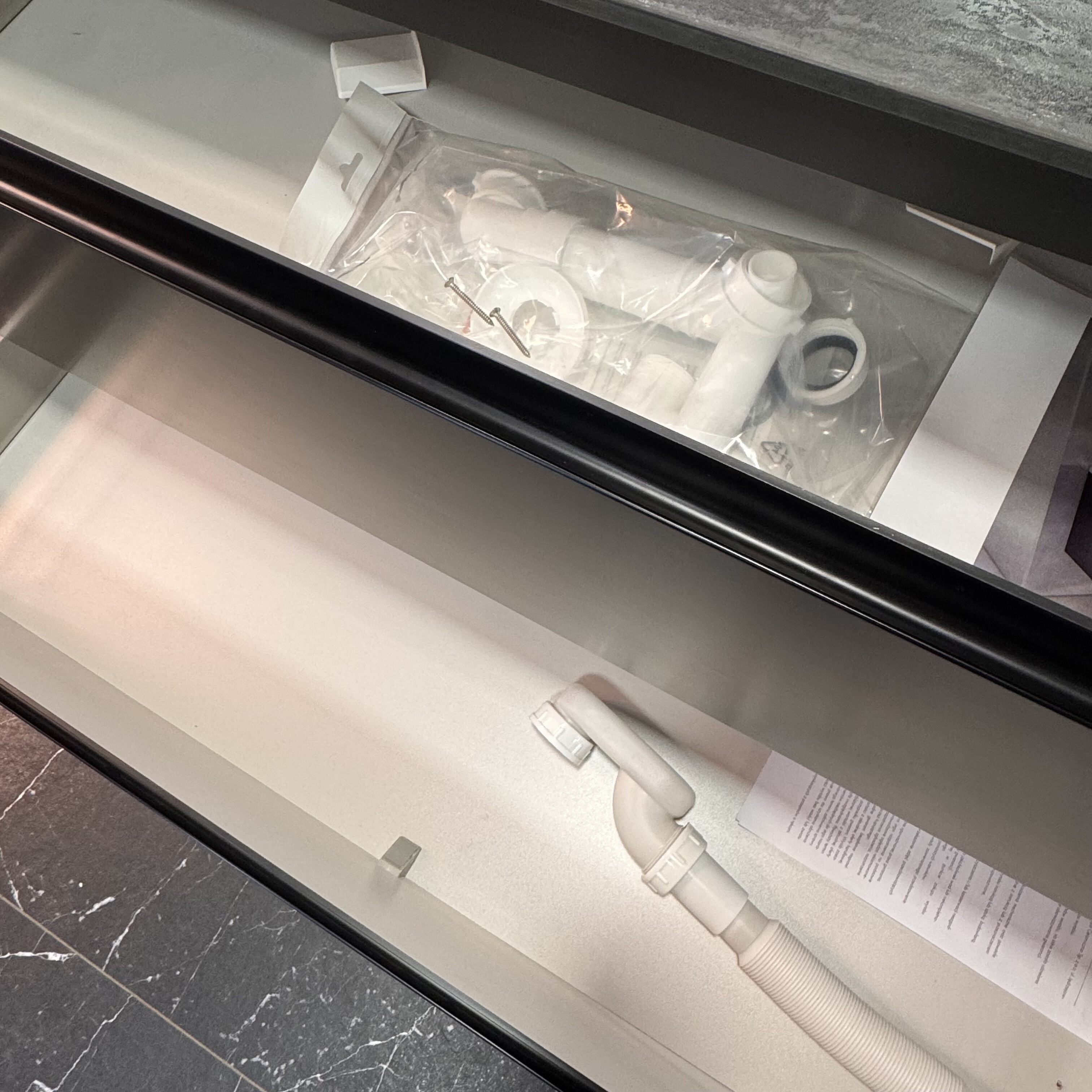 Produkt służył w salonie jako ekspozycja. Produkt jest w pełni sprawny, złożony, gotowy do montażu. Nie podlega zwrotom ani reklamacji. Szafka z blatem, nie obejmuje umywalki.