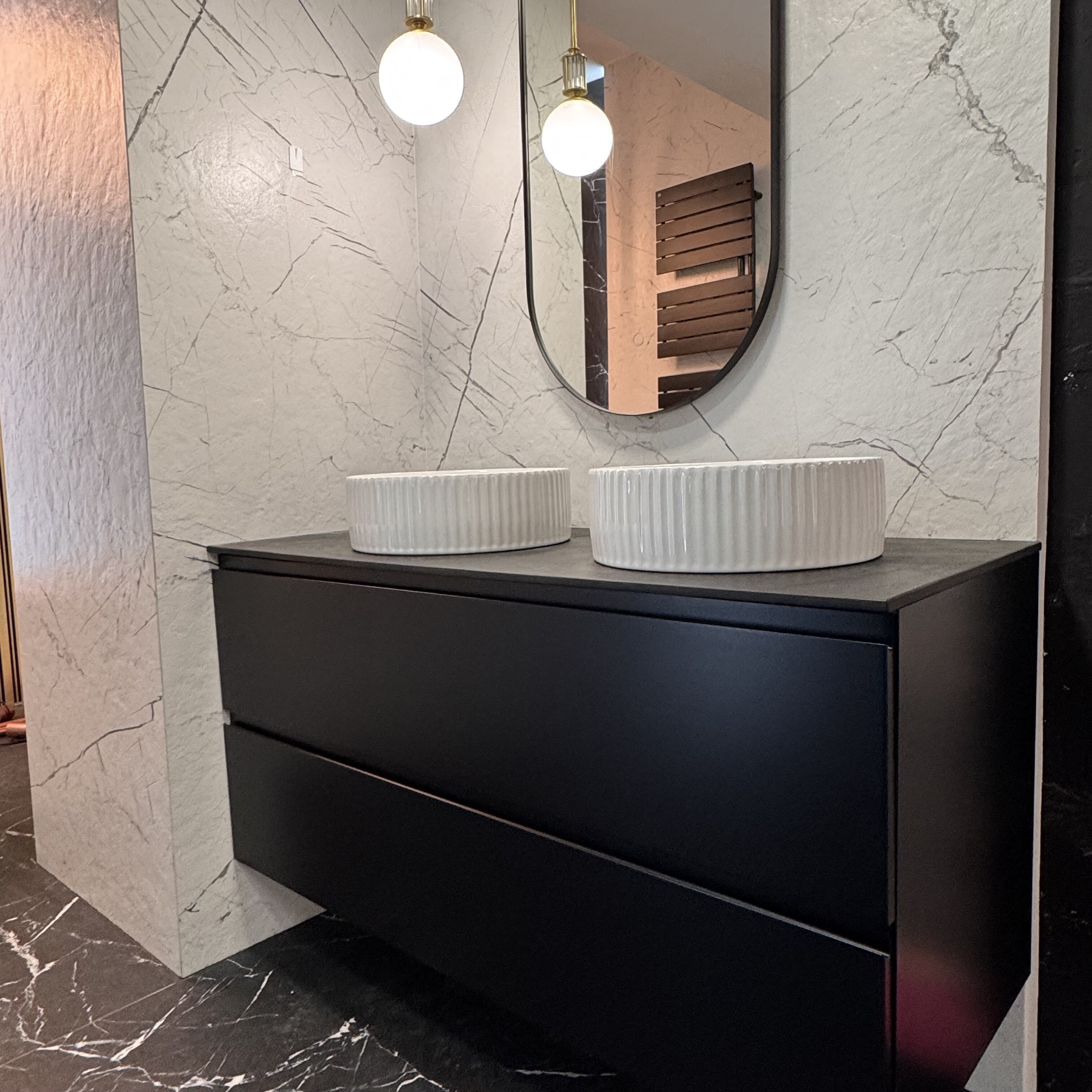 Nowoczesna szafka pod umywalkę o szerokości 120 cm z wodoodpornym blatem o grubości 12mm oraz imitacją czarnej lawy, pokrytym wysokogatunkowym laminatem HPL. Produkt w kolorze czarnym, idealnie pasujący do łazienki w stylu minimalistycznym lub loftowym. Solidna konstrukcja, płyta MDF i praktyczne rozwiązania zapewniają wygodne przechowywanie.